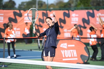La esposa del segundo en la línea de sucesión al trono británico es patrona de la centenaria Asociación Británica de Tenis (fue fundada a finales del siglo XIX) y hoy ha ido a visitarla. Se ha puesto el traje de tenista —pantalones cortos con sobrefalda tableada, chaqueta deportiva con cremalleras, impolutas zapatillas deportivas blancas y, por supuesto, la correspondiente raqueta— para echar un partido junto a la estrella de la temporada y flamante ganadora del Abierto de EE UU de tenis, la joven Raducanu, de apenas 18 años. Con el pelo recogido en una coleta, la duquesa ha llevado ropa cómoda y joyas discretas, pero no ha prescindido de su anillo de compromiso, el mismo de Diana de Gales y que le regaló Guillermo de Inglaterra en noviembre de 2010.
