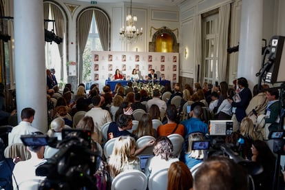 Las puertas para la presentación de la autobiografía de Isabel Preysler (Manila, 75 años) en el hotel Mandarin Oriental Ritz de Madrid se abrieron 30 minutos antes de que la protagonista de la jornada apareciese. La expectación era máxima: más de 100 periodistas —entre redactores, cámaras y fotógrafos— esperaban a la socialité, muchos de ellos ya sin sitio por la multitudinaria convocatoria. Ha tardado 10 minutos más en llegar, pero no lo ha hecho sola: le ha acompañado su hija Tamara Falcó. Hasta este 22 de octubre, su biografía, Mi verdadera historia, ha estado guardada bajo llave para evitar filtraciones. Y, en parte, lo ha conseguido.