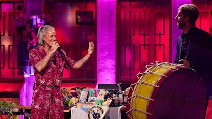 La cantante interpretó su icónico tema ‘Ahí estás tú’ ataviada con un pañuelo palestino y regaló a Broncano una de las prótesis mamarias que ha llevado consigo, en la que se podía leer un mensaje sobre el 25º aniversario del grupo