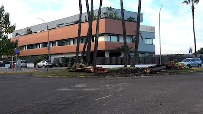 Han sido los bomberos de Alcalá de Guadaíra quienes han intervenido liberando el vehículo que había quedado atrapado en la rotonda tras haber chocado con las palmeras. “No hay que lamentar daños personales”, informaba la mañana de este lunes la cuenta en X de los bomberos; una publicación acompañada con varias fotografías del coche siniestrado.