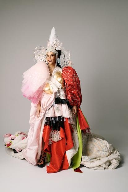 Otro de los elementos que forma parte de esta antología son las flores diseminadas del estilismo de 2019 y que han sido customizadas con tejidos de otras ediciones, el ala creada por BUJ Studio y que acompañó el vestido de Manuel Piña de 2021 o el parche circular que procede de la tienda de campaña de refugiados que llevó en 2023 a modo de abrigo y que confeccionó Garaizabal Studio.