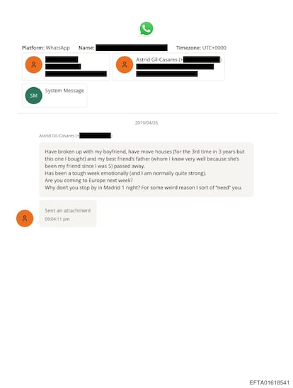 El estrecho vínculo entre la escritora y el magnate se confirma en los correos intercambiados dos semanas después (el 26 de abril de 2019), cuando ella le explica que acaba de romper con su novio —cuyo nombre no especifica—, coincidiendo con una nueva mudanza de casa —“la tercera en tres años”, dice— y la reciente muerte de un ser querido. “Ha sido una semana dura emocionalmente (y normalmente soy bastante fuerte). ¿Vienes a Europa la próxima semana? ¿Por qué no paras en Madrid una noche? Por alguna extraña razón, siento que te necesito”, le confiesa Gil-Casares al pedófilo. “Te he dicho que estoy en París, volé sobre ti anoche”, le responde él, junto a una foto tomada al exterior desde la ventanilla del avión. “No te preocupes, cuando digo que te necesito, es como amigo (así que no sientas ninguna presión). Es solo que siento una fuerte conexión contigo. Pero igual son simplemente invenciones mías basadas en cosas estúpidas que las mujeres sentimos como especiales (como el hecho de que hayas notado que tengo un nuevo tatuaje)”, continúa ella, que le insiste en que vaya a visitarla a París, coincidiendo en que no está con sus hijas.