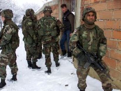 Soldados de la Kfor patrullan ayer por la población kosovar de Debelde, junto a la frontera con Macedonia.