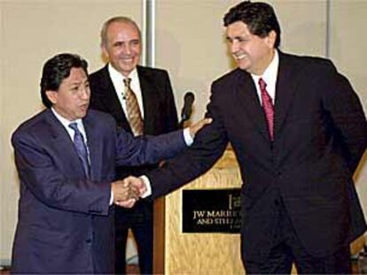 Alejandro Toledo (izquierda) saluda a Alan García antes del debate celebrado la noche del sábado en Lima.