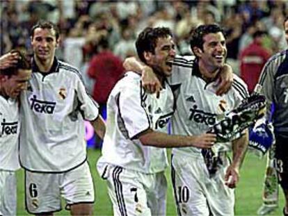 Raúl y Figo, en el centro, se abrazan sobre el césped del Bernabéu nada más cantar el alirón.