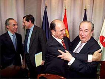 En primer plano, Emilio Botín y José María Amusátegui. Detrás, Ángel Corcóstegui con Matías R. Inciarte, el día de la fusión.