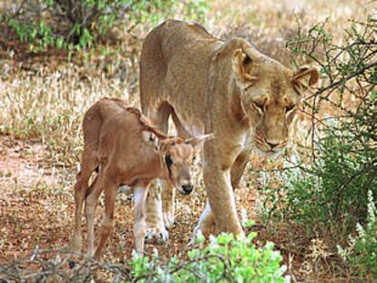 La leona del parque de Samburu, en Kenia, con su cría de órix adoptada.