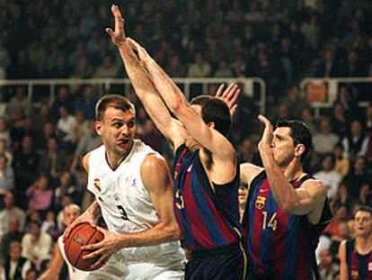 Partido de baloncesto de la Liga ACB: Tabak, con la pelota, trata de hallar entre Nacho Rodríguez y Rentzias. PLANO MEDIO -
