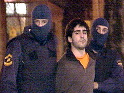 Un presunto miembro de un grupo de apoyo de ETA es flanqueado tras su detención por dos agentes del Cuerpo Nacional de Policía encapuchados. PLANO MEDIO - ESCENA - BORROSAS