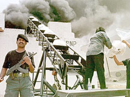 La policía antidroga peruana arroja bolsas de cocaína a una planta incineradora. PLANO GENERAL - ESCENA