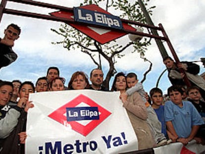 Un grupo de vecinos de La Elipa, debajo de una falsa entrada, muestra una pancarta en la que piden una línea de metro para su barrio. PLANO GENERAL - ESCENA