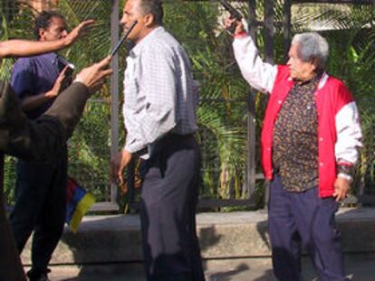 Un hombre armado con una pistola amenaza a los partidarios de la huelga general en Caracas. PLANO GENERAL - ESCENA
