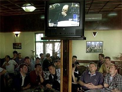 Un bar de Pristina lleno de albanokosovares mirando en la televisión la intervención de Rugova ante el Tribunal de La Haya. PLANO GENERAL - ESCENA