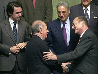 El presidente chileno, Ricardo Lagos, saluda al jefe de Estado francés, Jacques Chirac, ante el presidente del Gobierno, José María Aznar, y el presidente de Brasil, Fernando Henrique Cardoso