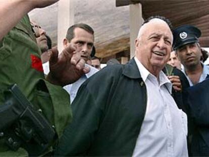 Rodeado de guardaespaldas, Ariel Sharon, primer ministro israelí, visita el asentamiento de Alfei Menashe, cerca de la ciudad palestina de Kalkilia