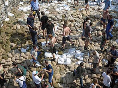Un grupo de voluntarios trabaja en la construcción de un dique con sacos de arena en un complejo químico cercano a Bitterfeld, al este de Alemania