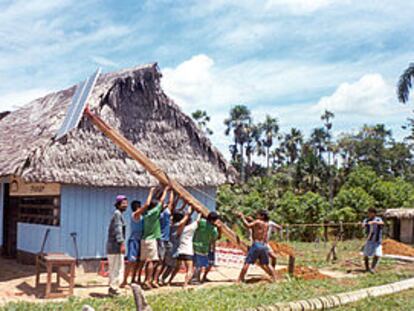 Colocación de una torre con panel de energía solar para dar servicio a uno de los centros de salud levantados por EHAS en la selva peruana.