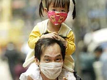 Un padre y su hija en Hong Kong llevan mascarillas contra la neumonía.