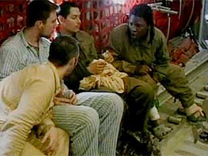 Cuatro de los prisioneros de guerra estadounidenses conversan a bordo de un avión que los trasladó ayer a Kuwait.