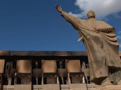 Estatua de Sadam Husein ante el edificio de la Biblioteca Nacional