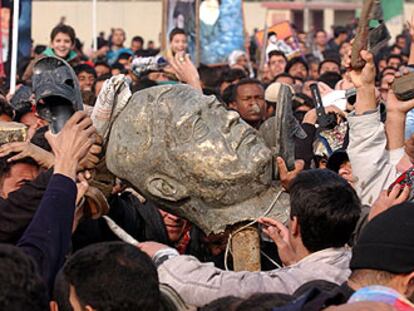 Fieles chiíes golpean un busto de bronce de Sadam Husein