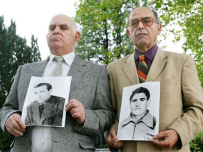 Sergio Hernández (izquierda) y Antonio Martín muestran las fotos de Delgado y Granado, ejecutados por los atentados cometidos por aquéllos.