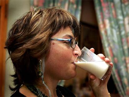 Una mujer toma un vaso de leche