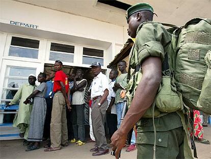 Un soldado congoleño hace guardia en el aeropuerto de Bunia