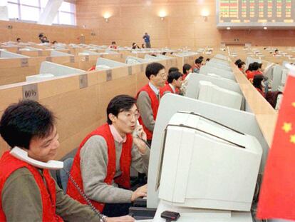 Agentes bursátiles dan órdenes de compraventa en la Bolsa de Shanghai