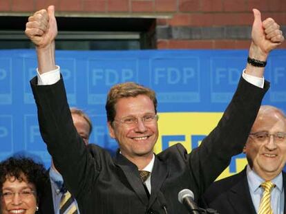 Guido Westerwelle, líder del Partido Liberal, celebra los primeros resultados con miembros de su formación