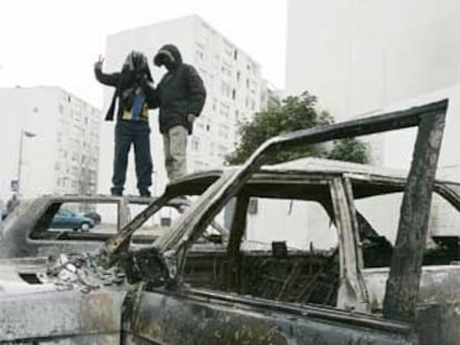 Dos jóvenes encapuchados en uno de los automóviles quemados en Sevran, cerca de París