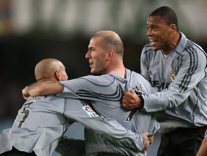 Zidane recibe los abrazos de Roberto Carlos y Baptista