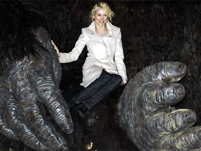 La actriz Naomi Watts, entre las manos de la réplica de King Kong, en Times Square, Nueva York