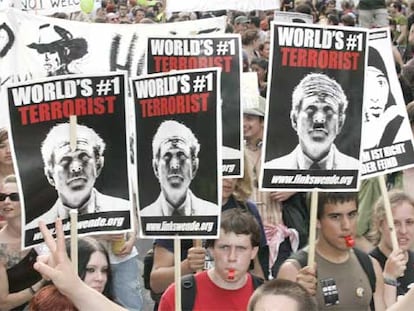 Manifestantes llevan pancartas que señalan a Bush como el terrorista número uno del mundo en Viena