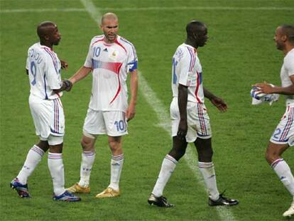 Govou, Zidane, Thuram y Henry, se felicitan tras el partido de semifinales contra Portugal