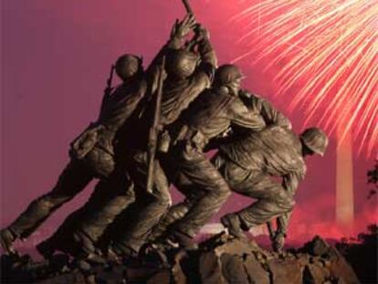 Fuegos artificiales iluminan el monumento de Iwo Jima, en Washington