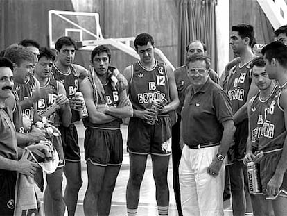 Antonio Díaz Miguel, rodeado de sus jugadores en 'Barcelona 92'