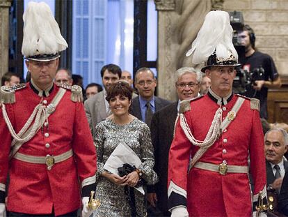 Unas 500 personas se manifiestan ante el Ayuntamiento de Barcelona a favor y en contra del pregón en castellano de Elvira Lindo. -La escritora dice que se siente de Barcelona, "ciudad donde la libertad parece llevar unos pasos por delante"
