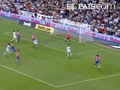 Diego Forlán no pudo estrenarse en liga con el Atlético. El uruguayo remate prefectamente de cabeza, pero el tanto no sube al marcador ya que se encuentra en clara posición de fuera de juego.