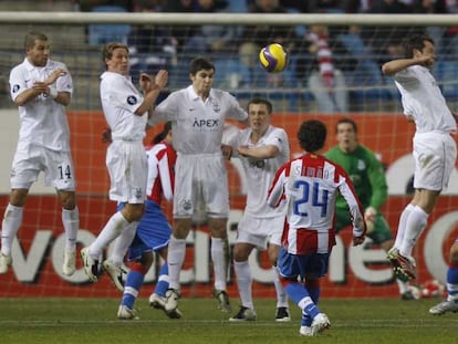 Simao lanza la falta que supuso el segundo gol del Atlético