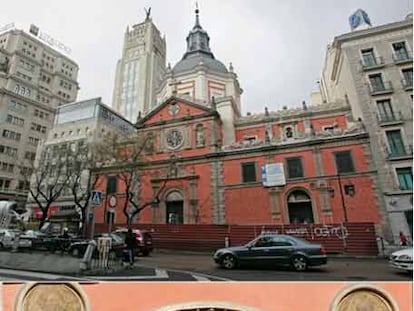 Iglesia de las Calatravas y detalle del dintel de la puerta de la fachada de donde fue borrada la efigie del rey consorte