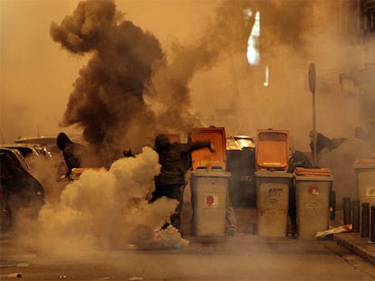 Contenedores ardiendo en el barrio de Lavapiés, Madrid
