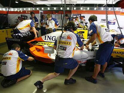 Ingenieros de Renault trabajan en uno de los coches de la escudería en el Gran Premio de España