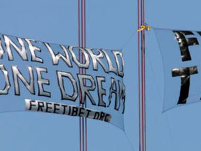 Tres activistas por la libertad en el Tibet cuelgan carteles y banderas en el puente de San Francisco