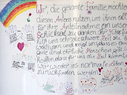 La pancarta, confeccionada por los hijos-nietos del monstruo, ha sido pegada en un escaparate de la plaza principal de Amstetten