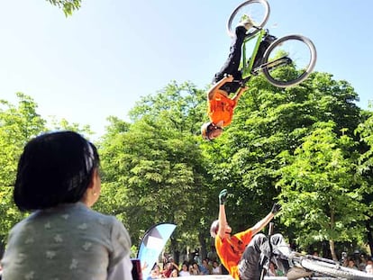 Jóvenes ciclistas hacen acrobacias en el Retiro