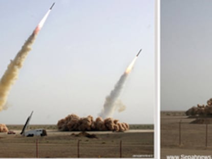 La foto del lanzamiento de prueba de los cohetes iraníes, publicada en casi todos los diarios del mundo, muestra cuatro misiles, cuando en realidad salieron tres.- El cuarto fue disparado después