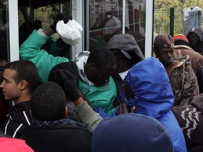 Un grupo de inmigrantes recoge bocadillos en la Cruz Roja