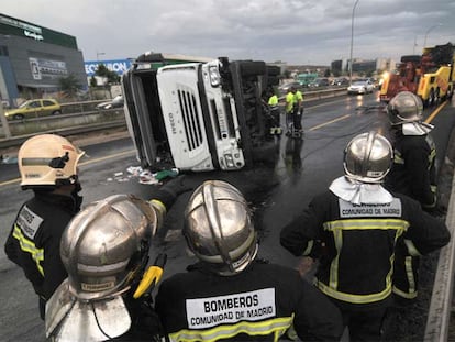 Un camión volcó como consecuencia de la lluvia en los carriles de entrada de la autovía de Valencia