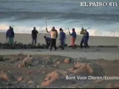 Un grupo defensor de animales muestra un video con la matanza de focas en una playa de Namibia